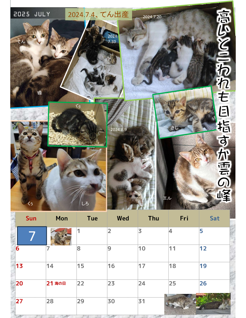 昨年7月4日に野良猫だった「てん」(旧名・もも)ちゃんが、6匹の仔猫を産み、そのうち5匹が我が家で育っていきました。